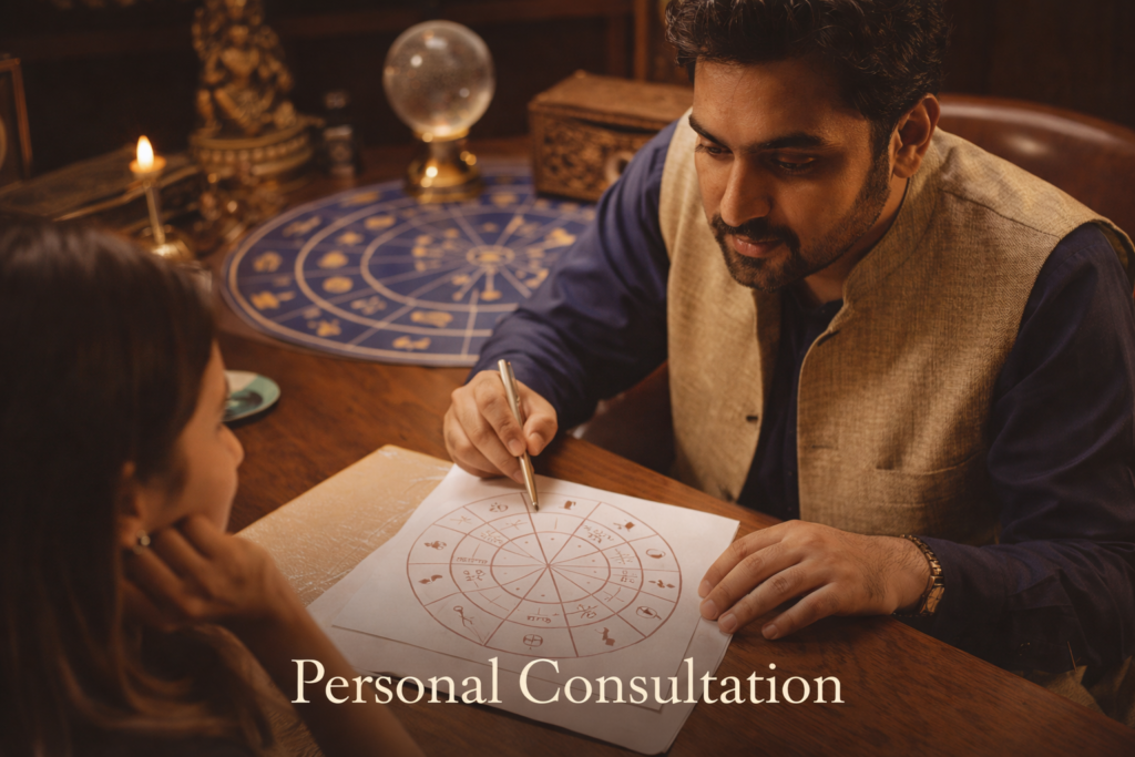 Our Personal Consultation service offers one-on-one guidance to help you understand the influence of planets and numbers in your life. Through detailed analysis of your birth chart and personal details, Astro Ratnesh provides insights and practical remedies related to career, relationships, health, and life decisions.